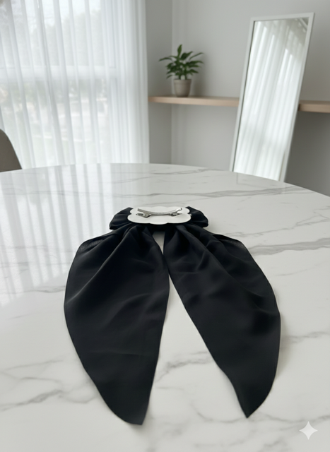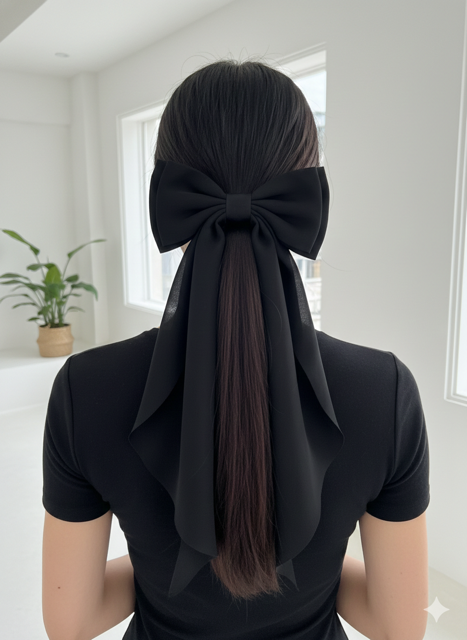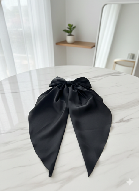 Elegant black bow hair accessory crafted from soft chiffon with long flowing tails. Perfect for ponytails, low buns, and formal or everyday hairstyles.